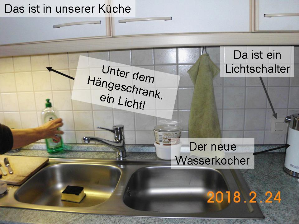 Weiter unten im Foto sieht man ja schon alles. Wir haben in der Küche, unter einem der Hängeschränke, ein Licht, Neon, das scheint auf die Spülbecken und das Schneidebrett. Die Deckenlichter sind zwar wirklich sehr hell, aber man hat sie im Nacken und so wirft man seinen eigenen Schatten auf das, was man da so tut in der Küche. Also, das extra Lichtlein dort ist schon sehr recht am Platz. Es hat seinen eigenen kleinen Schalter, und wir haben es also schon bald nach dem Einzug gewohnheitsmäßig 'blind' an der rechten Stelle eingeschaltet.