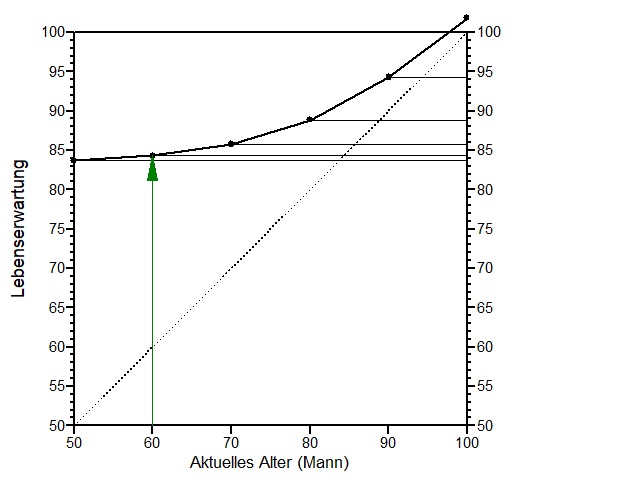 Ob die Formel nun genau stimmt - wahrscheinlich nicht. Und das Ergebnis hat natürlich eine Schwankungsbreite, die um das Ergebnis liegt, und nach oben etwas enger, nach unter etwas breiter schwankt. Das Intervall ist bei der Lebenserwartung eines 60-Jährigen etwa 8 Jahre, und schwankt um den Wert von 84,3 Jahre. Die Formel für Männer, die ich fand, lautet: Ewartetes Sterbejahr = 10,2*ln[3526 + exp(aktuelles Alter/10,2)].