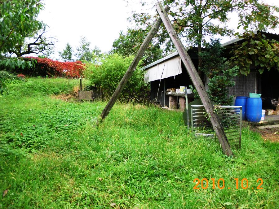 Es gibt oben, unter der namenlosen Hütte, noch einen kleineren Stahltank, vielleicht 500 Liter, der (nach dem Prinzip der kommunizierenden Röhren) vom Dach der oberen Hütte gespeist wird. Zeitweise war der auch voll mit Regenwasser. Er liegt höher als der große Tank, von dort aus konnte man Wasser besser mit dem Schlauch zu den Himbeeren oder was auch immer laufen lassen. Den Hauptinhalt dieser Hütte, den Anhänger mit der verbogenen Deichsel, wollte Fabian auf sein Ackerstück nach Auerbach stellen. Das ist ganz wie es Adolf Link machen würde, erstmal irgendetwas Legales auf ein Grundstück stellen, bis dann irgendwann daraus ein festes Gebäude als Stützpunkt wird. Tatsächlich aber gibt es neuerdings (Ironie) Behörden, und Fabian wurde das nicht genehmigt.