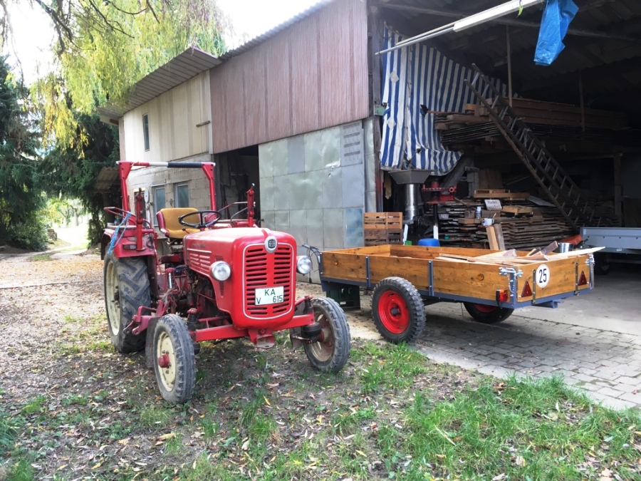 Es gab in der Villa-Altblick einen Traktor, einen Lanz Bulldog. Ich denke es war ein Lanz 2206, etwa aus dem Jahr 1953, mit 13 oder 17 PS oder so. Damit wurde gepflügt (das hieß gezackert), gegrubbert (das hieß kultiviert), geeggt (dazu musst man hinterher laufen und die Egge schaukelnd bewegen, damit sie nicht verstopft).