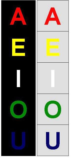 A klingt rot, U klingt blau, O klingt grün (oliv-grün), E klingt gelb, I klingt weiss.