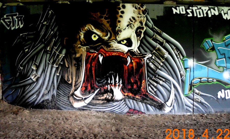 Unter der Otto-Frey-Brücke in Göttingen, sozusagen unter der Polizei, ganz nahe beim Wasser der Leine, wohnt ein Ungeheuer ### Nachtrag 1.6.2018: das Ungeheuer 'hat sich hinter einen Farbvorhang' zurückgezogen, man kann wieder un-erschrocken vorbeifahren ### ;-)
